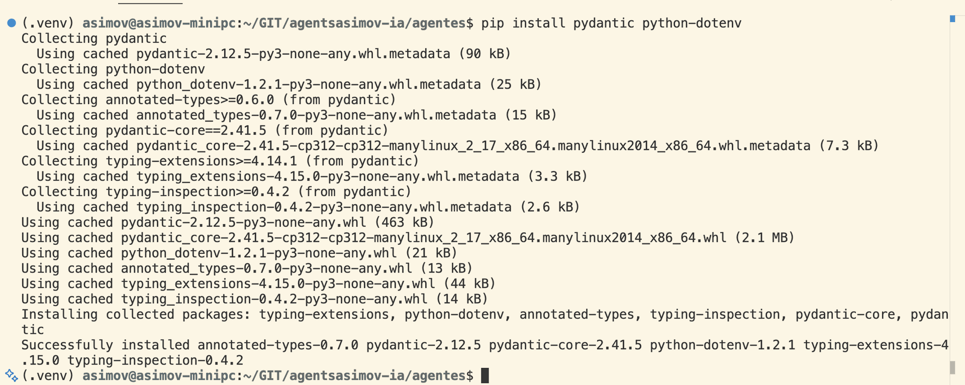 Para simplificar la serialización JSON de los payloads, también instalaremos pydantic y python-dotenv para gestionar variables de entorno.