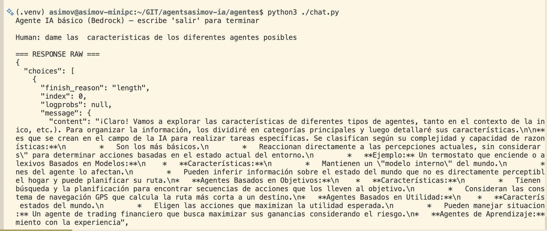 Este script crea un bucle interactivo similar a ChatGPT. El prompt sigue la convención de Claude (Human: / Assistant:) pero puede adaptarse a otros modelos cambiando la estructura.